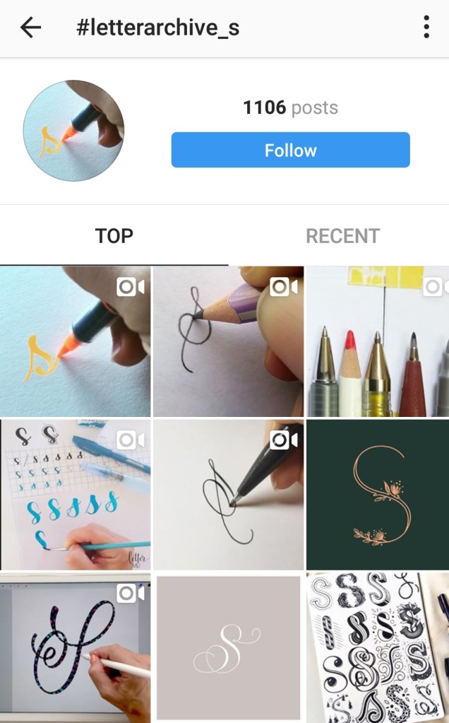 Y’all. This resource is A-M-A-Z-I-N-G. It is the collected work of the lettering community on Instagram. You can look through their feed to find hundreds of styles of lettering, and get inspired to find your own style! If you’re looking for a particular letter, search by hashtags: #letterarchive_[insert letter here]. For example, #letterarchive_s reveals this: