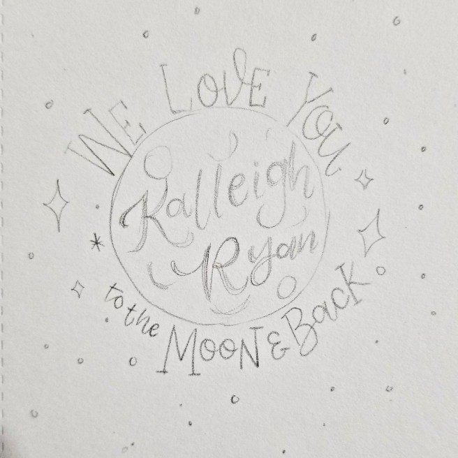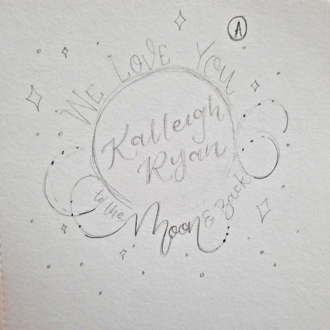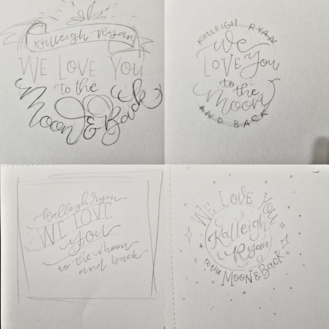 To be honest, designing this piece challenged me. Combining both her name and “We love you to the moon and back” was tough. When I sketched things out, I would get the name right, but not the phrase–or vice versa. Because Katherine wasn’t under a time crunch, I took time to research, practice, and research some more. I used Stefan Kunz’s technique of forcing myself through multiple designs, then landed on these 8 that I sent to Katherine: