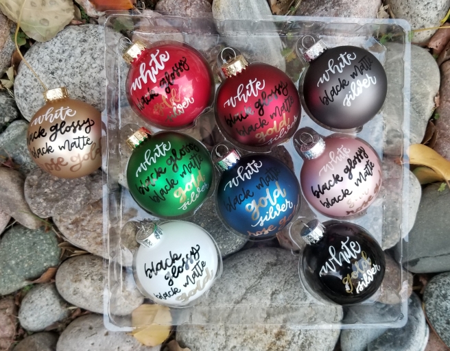 For my ornaments, I use Decocolor Extra Fine markers. Other fellow calligraphers who are willing to share said that they have had success with Molotow Liquid Chrome (I’ve seen samples — they look fabulous! But this is only available in silver), and Craftsmart Premium (with the caveat that not all Craftsmart Premium markers are equal). (Credit: Thank you to Molly Mask @mollymasklettering, Melissa Nguyen @calligracrafty, and Lorin B @letterly.signsandlettering for sharing your success stories! Find these lovely ladies on Instagram)