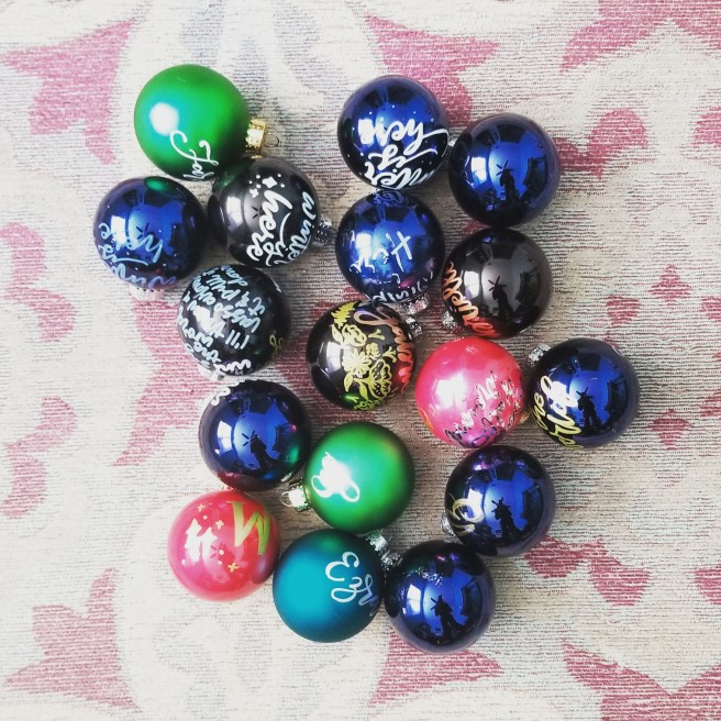- Sharpie metallic permanent markers did surprisingly well on the matte teal, matte blue, and glossy black ornaments. On all the others, the solvent stripped the paint on the ornaments, making the lettering come out distorted.