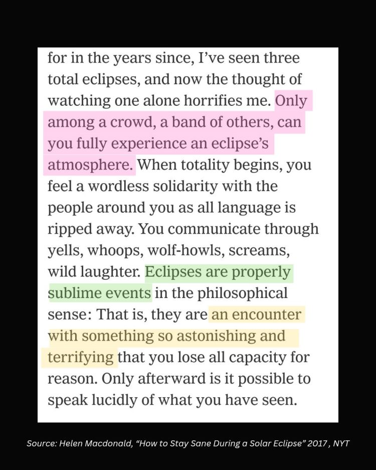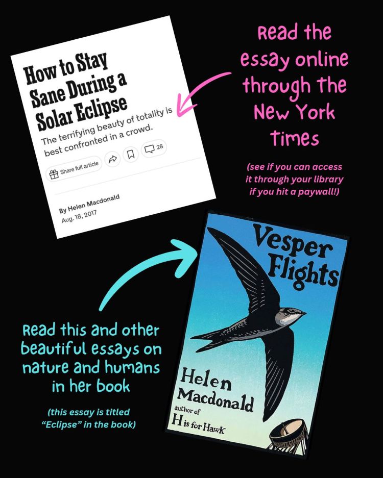 Whatever your thoughts are on the eclipse, see if you can read this essay (link to NYT article here; I highly recommend the entire book Vesper Flights). Yes, she’s literary and thoughtful, and she may seem a bit melodramatic about it all, but it’s also beautiful. I hope it sparks some curiosity in you!